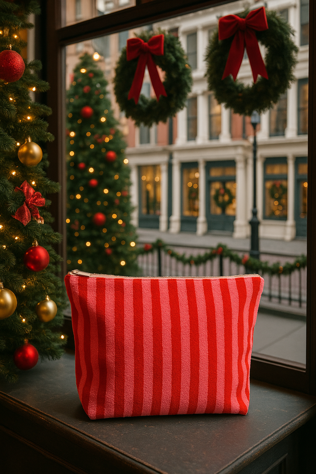 Frottee Kosmetiktasche in Rot & Pink – Stylische Makeup-Tasche im Streifenlook | Ideal für Reise & Alltag